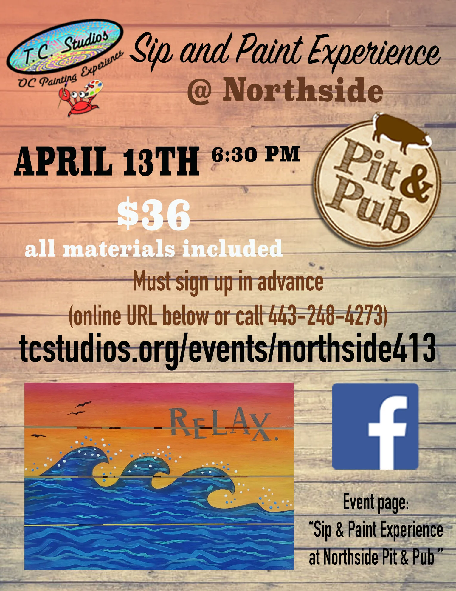 "Relax" Handmade wooden pallet signs! Our artist will lead you through the painting process step-by-step, and by the end of the night, you'll go home with a super cool wooden sign that you can hang in your home!